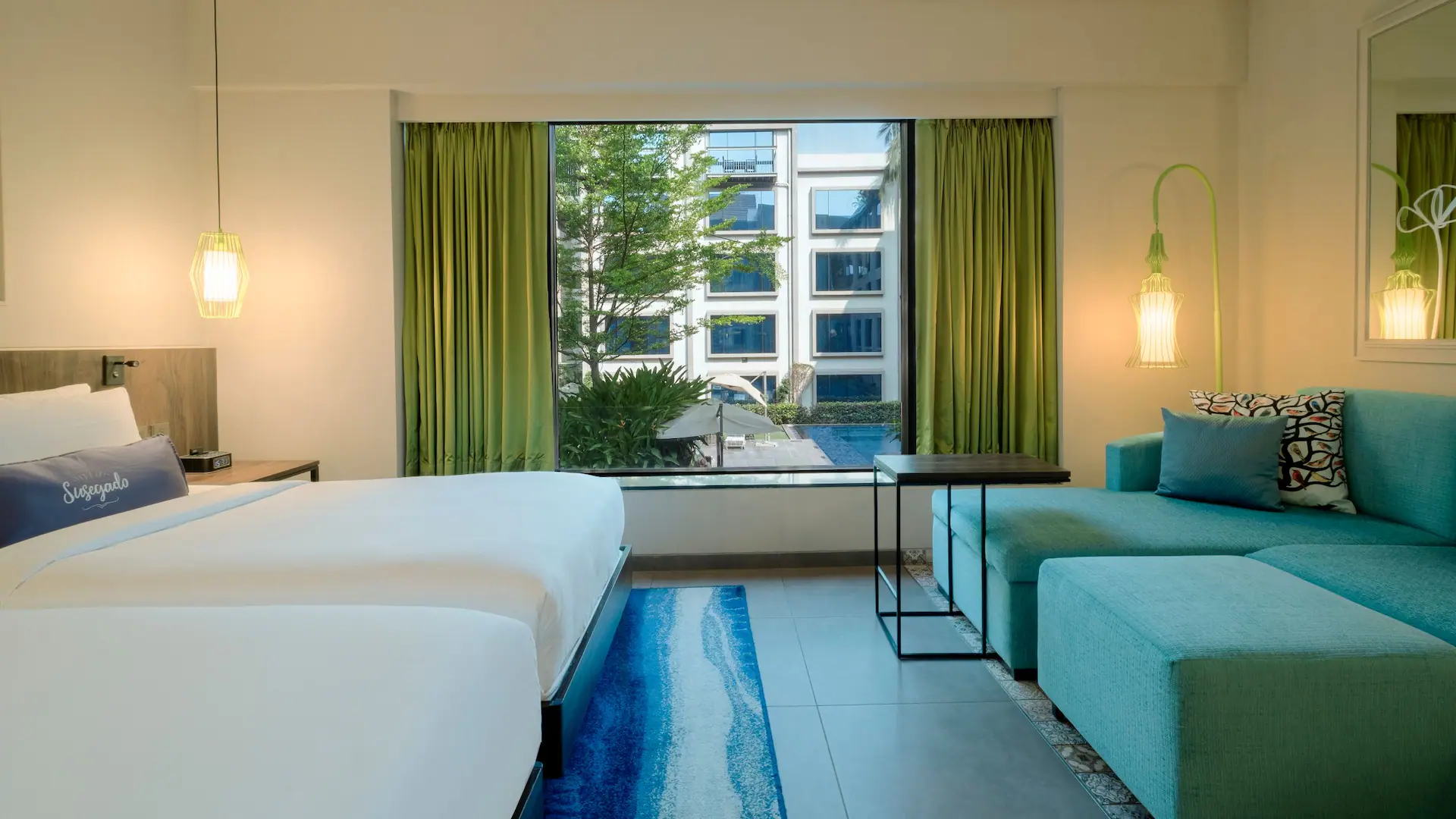 Stylish 26 m² room with two comfortable twin beds and refreshing pool views, sleeper sofa and contemporary bath — great for friends or small families.
